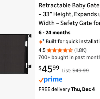Retractable baby gate, 55”, new: $20